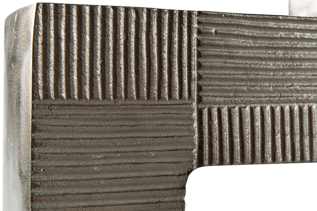Stunning from all angles, this vase's contemporary geometric form acts as a captivating focal point for your mantle or bookshelf. Its antiqued nickel-tone body is detailed with subtle texture for added visual appeal. What a perfect fit for those seeking forward-thinking style.