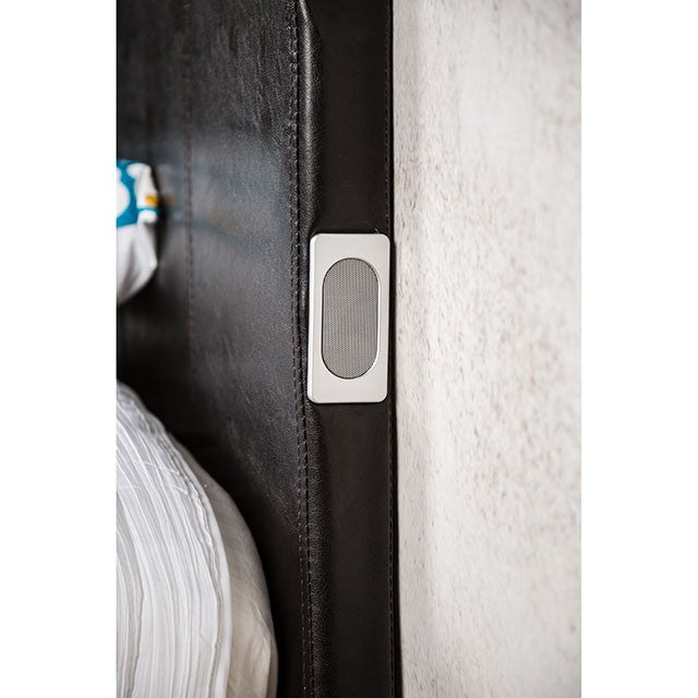 Rest easy with a modern platform leatherette upholstered bed. Our great looking, simple, no frills upholstered bed with classic Parson style headboard with Bluetooth equipped makes for a nice space to lean up against. A trend-proof look that is always easy to personalize and update with a change of bed sheets and decorative pillows.